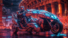 Cyber gladiator on neon-lit motorcycle in ancient futuristic arena