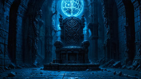 Mystical throne room in gothic ruins illuminated by enigmatic blue light