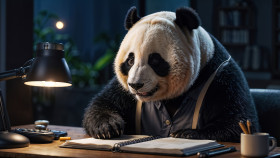 A plump orange tabby cat wearing a chef's hat is cooking a meal with its tiny mouse friend