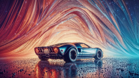 Big wheel race car with colorful wave shaped background