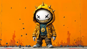 Stylized Cartoon Character with X-Shaped Eyes in Post-Apocalyptic Art