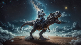 Astronaut Rider on a Roaring Dinosaur Above the Clouds