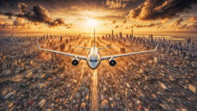 A high-quality digital image of a jet airplane flying directly above a modern city toward the glowing sunset. The skyline is filled with tall skyscrapers, warm golden light, and dramatic clouds, creating a cinematic and realistic view. The artwork perfectly represents travel, aviation, technology, and the beauty of modern urban landscapes