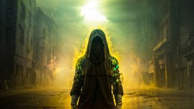 A man standing on a city street, surrounded by a fiery explosion, with a yellow glow emanating from him