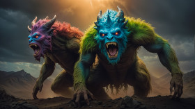 Two fantastic creatures with fur and horns standing on a rocky surface